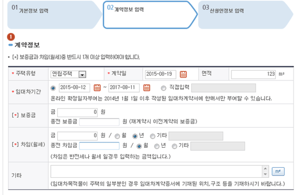 <신청서 작성 및 제출> 메뉴를 클릭하여, 정보들을 모두 입력한다. (주소, 임대인, 임차인 등등)