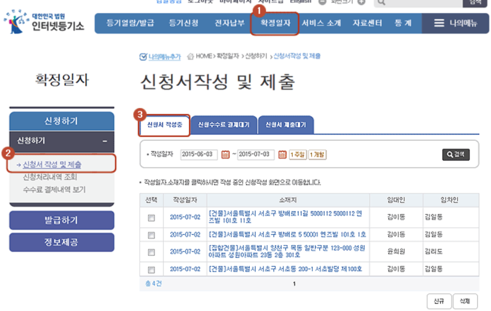 3. 확정일자 메뉴 > 신청서 작성